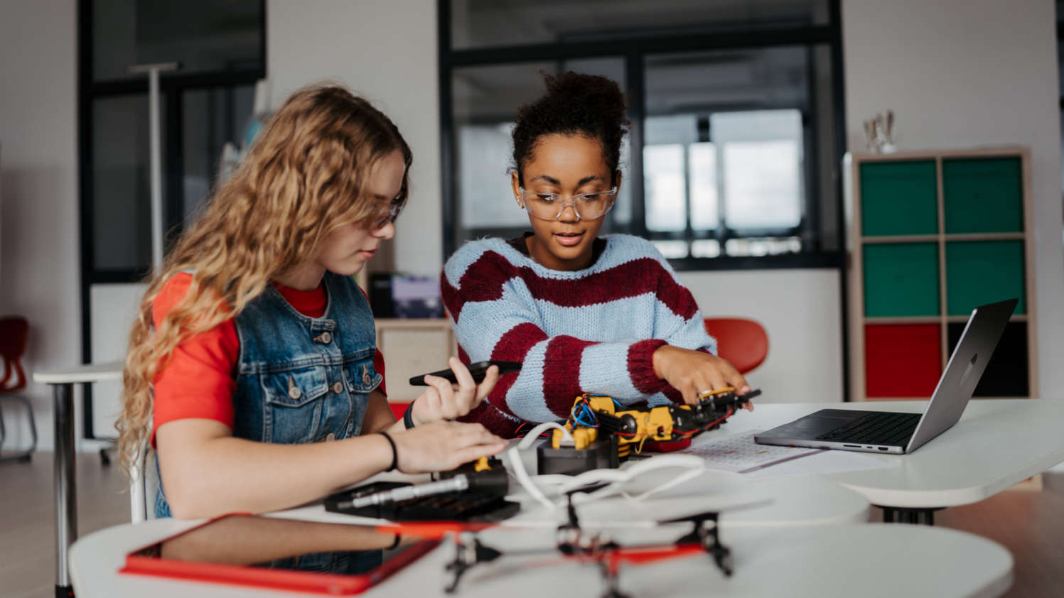 Caption: Two high school students actively engaging with AI learning tools and robotics to explore new concepts in the classroom.